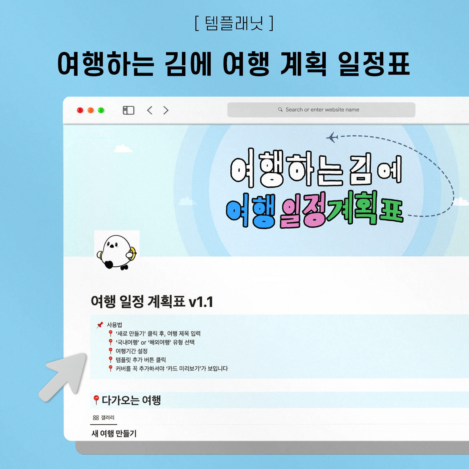 홈/노션/여행하는 김에 여행 일정 계획표 v2.0크리에이터템플래닛노션여행하는 김에 여행 일정 계획표 v2.00원총 상품 금액0 원구매하기장바구니찜하기구매 안내디지털 상품은 구매 즉시 다운로드 가능합니다결제 후 3일 이내 환불 신청 가능 (이후 자동 구매확정)문의사항은 크리에이터에게 직접 연락해주세요상품 상세정보관련 상품더보기여행하는 김에 여행 일정 계획표 v2.00원구매하기