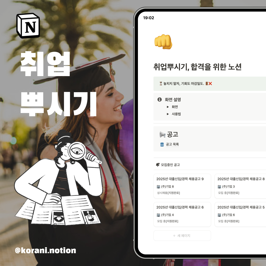 홈/노션/[노션템플릿] 취업 뿌시기, 합격을 위한 노션크리에이터정리왕고라니노션[노션템플릿] 취업 뿌시기, 합격을 위한 노션10,000원총 상품 금액10,000 원구매하기장바구니찜하기구매 안내디지털 상품은 구매 즉시 다운로드 가능합니다결제 후 3일 이내 환불 신청 가능 (이후 자동 구매확정)문의사항은 크리에이터에게 직접 연락해주세요상품 상세정보관련 상품더보기[노션템플릿] 취업 뿌시기, 합격을 위한 노션10,000원구매하기